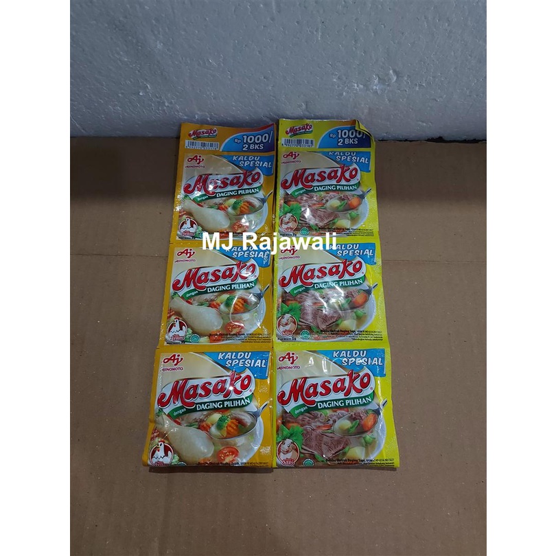 Masako bumbu penyedap rasa ayam / sapi kemasan 9 gram. Dijual per renceng. 1 renceng isi 12 pcs. Expired lama.