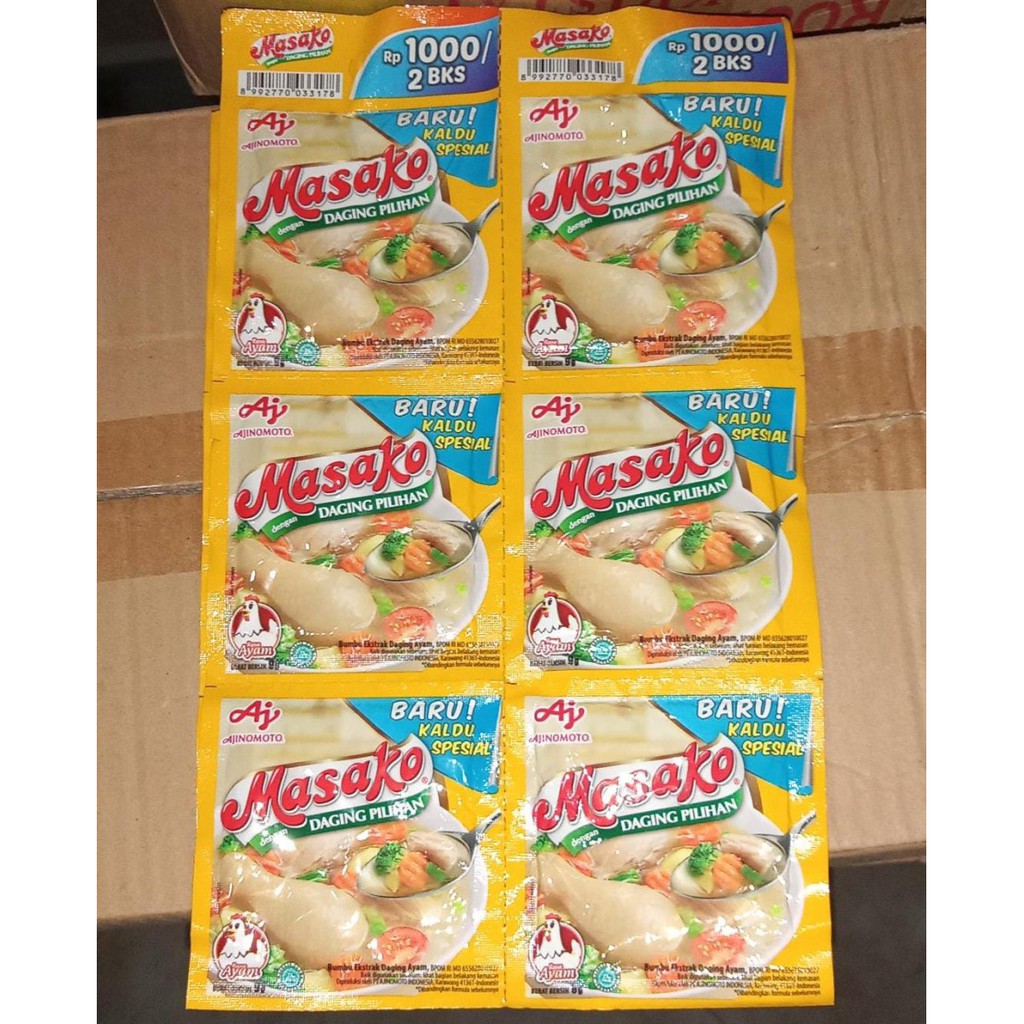 Masako Kaldu Ayam dan Sapi 1 Renceng isi 12 bungkus x 9 gr.