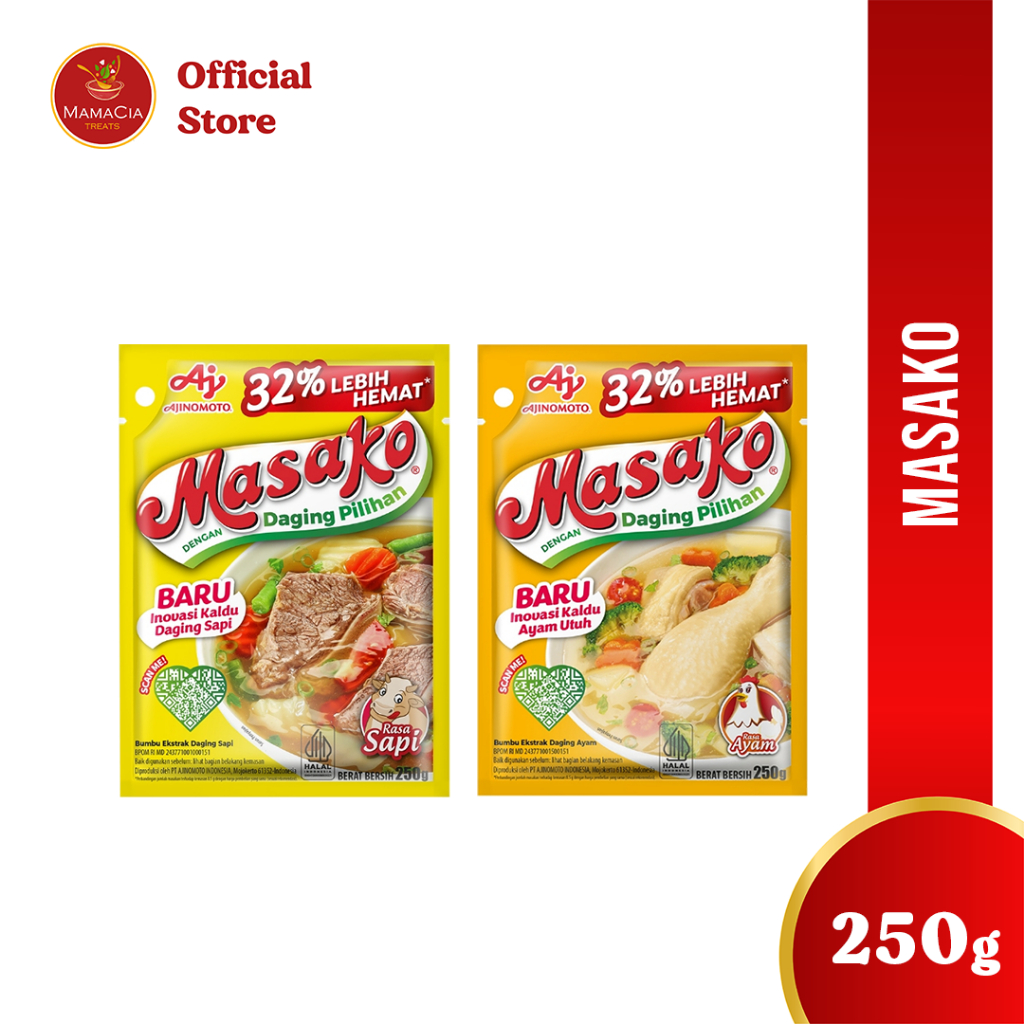Kemasan 250gr Masako® bumbu ekstrak daging ayam, dibuat dengan daging ayam yang berkualitas serta kombinasi bumbu dan rempah pilihan. Menghasilkan rasa kaldu yang lezat, seperti kaldu buatan sendiri di rumah, untuk masakan sehari-hari dengan cara yang mudah dan praktis. Masako® sajikan #KenikmatanHakiki untuk keluarga, makanan jadi makin enak dan lezat, jadi pingin tambah lagi! Kandungan garam/ natrium 520 mg per sajian Sesuai dengan angka kecukupan gizi yang direkomendasikan yaitu