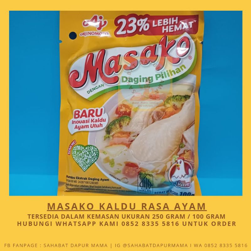 Masako Kaldu Rasa Ayam 100gram adalah bumbu kaldu penyedap rasa daging ayam yang dibuat dengan perpaduan tepat antara daging segar berkualitas, bumbu, dan rempah pilihan yang memberikan rasa dan aroma masakan dari daging ayam asli sama seperti kaldu buatan di rumah. Cocok untuk rumah makan atau restauran, katering, pedagang makanan, dan industri kecil.