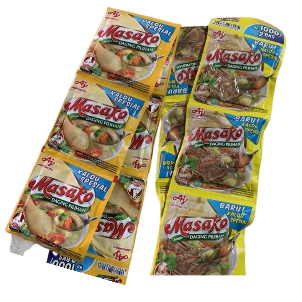Penyedap rasa kaldu rasa sapi dan ayam bubuk kemasan sachet 9 gram.