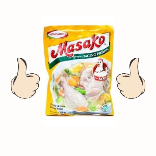 Kaldu masak Masako rasa ayam dengan kemasan 250gr. Produk Halal dan aman.