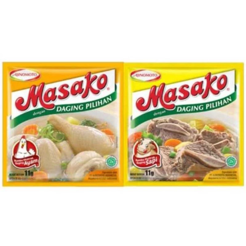 Masako bumbu penyedap makanan rasa kaldu ayam dan sapi merupakan bumbu pelezat masakan yang terbuat dari bahan-bahan dan rempah pilihan, termasuk daging sapi dan ayam pilihan yang direbus lama. Memberikan rasa kaldu yang mantap pada masakan Anda. Tambahkan masako kaldu ayam atau sapi ke dalam masakan rumah. Mudah larut dalam masakan.