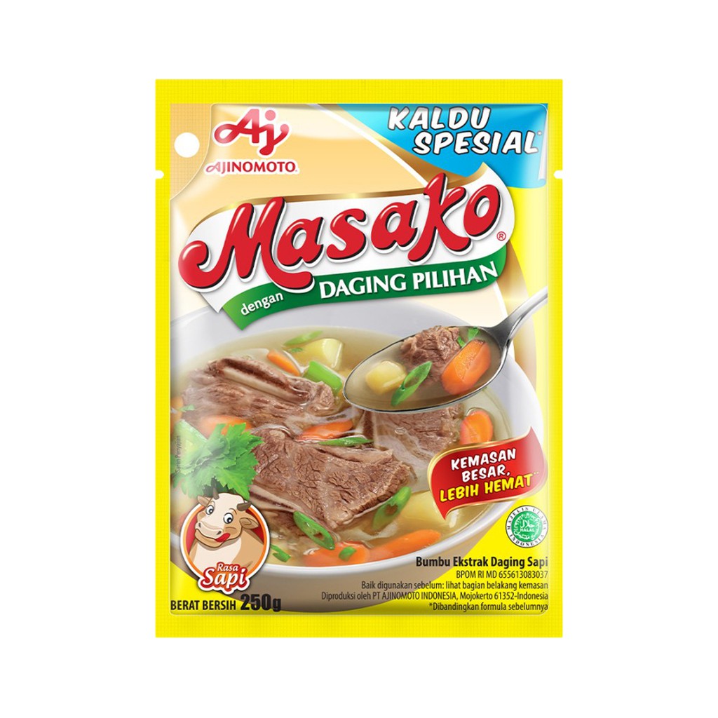 Masako rasa sapi bumbu kaldu penyedap dibuat dengan perpaduan sempurna antara daging segar berkualitas, bumbu dan rempah pilihan