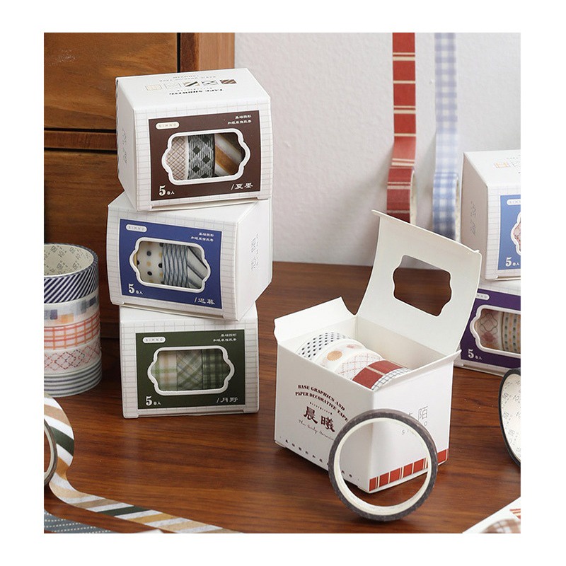 Satu kotak masking tape Base Graphics berisi 5 rol selotip dekorasi dengan pola-pola basic dan kombinasi warna yang berbeda-beda. Desainnya yang simpel cocok digunakan baik di atas latar polos maupun dikombinasikan dengan desain lain tanpa terlalu terlihat mencolok.