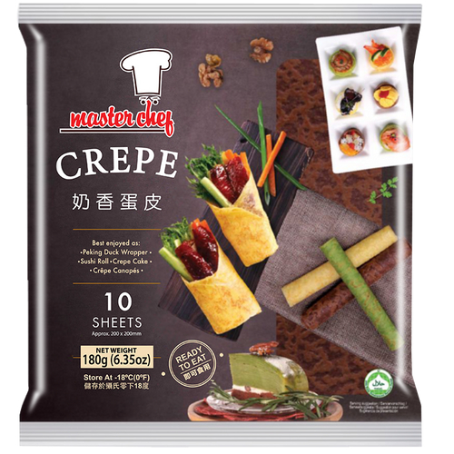 Master Chef Crepe 10 sheet 180 gr adalah panekuk tipis yang terbuat dari gandum dan merupakan makanan yang sangat digemari di seluruh Eropa dan tempat lainnya. Bahan utama dari crepes adalah terigu, telur, susu, mentega, dan garam.