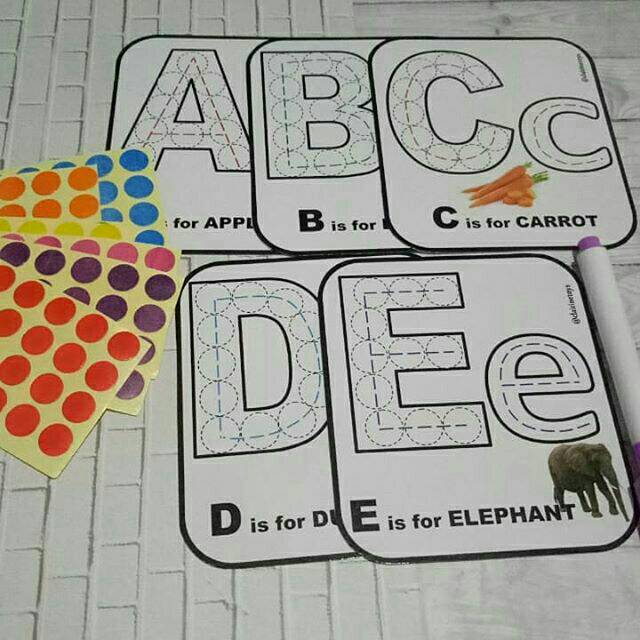 Mainan edukasi anak belajar menulis angka dan huruf. Satu set terdiri dari 10 sticker berbeda warna, spidol, dan kartu bergambar angka. Kertas yang telah terkena spidol dapat dihapus lagi, sehingga dapat digambar lagi.