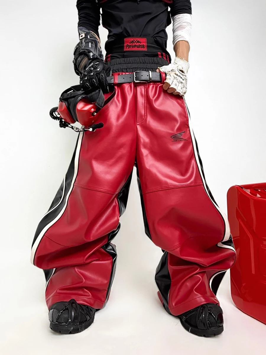 Mauroicardi Весна Осень Оверсайз Длинные Широкие Свободные Патчворк ПУ Кожаные Брюки Мужские с Двойным Поясом Цветной Блок Роскошная Дизайнерская Одежда Уличная Мода Подиумная Мода 2025 кожаные штаны мужские