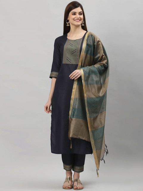 ALC Creations Women Navy Blue Colourblocked High Slit Pure Cotton Kurta with Salwar & With Dupatta