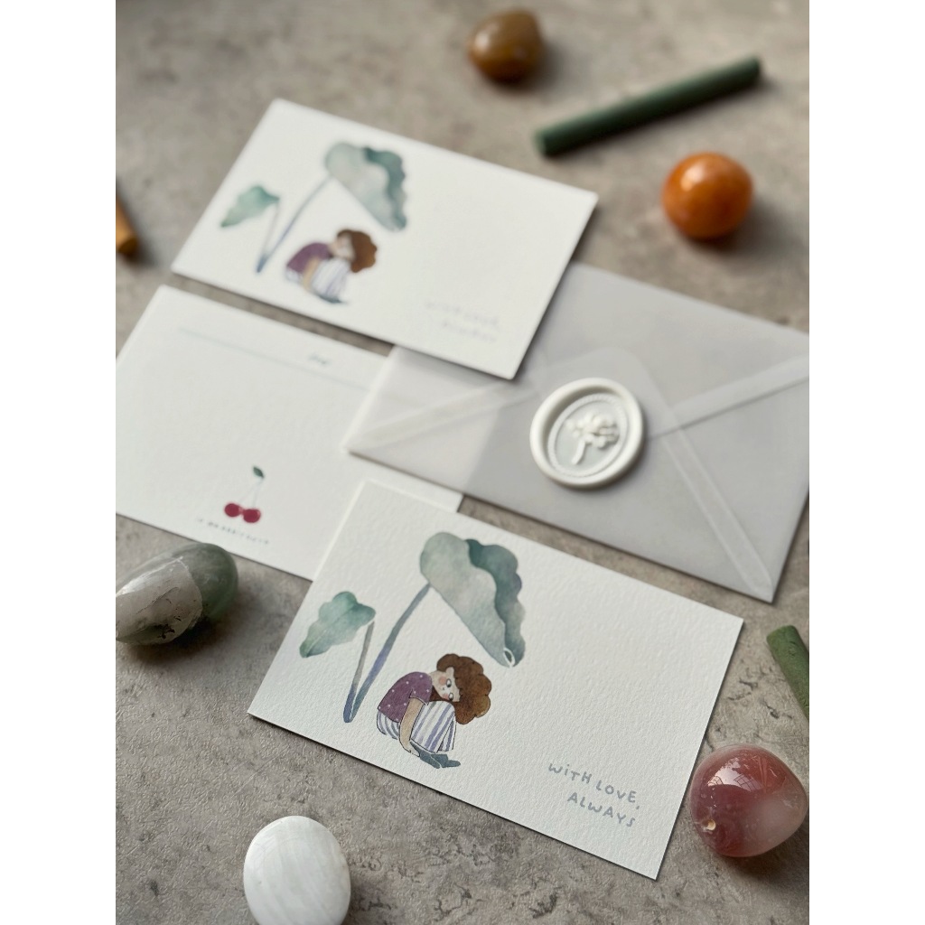 Comes in A7 size, the postcard is a set with translucent envelope.