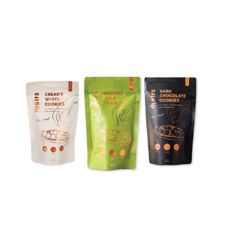 Melts Cookies, merupakan snack sehat yang dibuat dari chocolate asli. Didalamnya dilapisi chocolate membuat semua gigitannya terasa enak sekali. Dark Chocolate Cookies ini mengandung 55% Pure Cocoa dengan sedikit gula jagung membuat produk ini memliki rasa yang pas antara manis dan gurih.