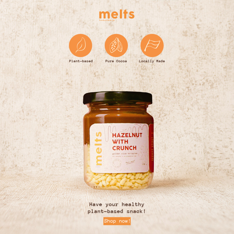 Melts With Crunch INGIN YANG MANIS MANIS TAPI TAKUT GENDUT? Only 51 calories per serving (10 gram) VARIAN RASA: Hazelnut BERAT BERSIH: 130g GLASS JAR WITH ALUMINIUM SEAL DELIVERY : Aman pengiriman ke seluruh Indonesia (Double safety with bubble & box) SARAN PENYIMPANAN : dapat disimpan di suhu ruangan , tidak perlu di kulkas How To Enjoy: Letakkan botol ini di dalam wadah berisi air hangat secara terbalik Tunggu 5 sampai 10 menit Buka dan siap untuk dinikmati! Komposisi Hazelnut With Crunch: Tepung beras, hazelnut, kokoa bubuk, mentega kakao, minyak nabati, garam, dan soya lecithin We are Plant based: Tidak mengandung bahan hewani (susu hewan, dairy, mentega hewani, dll), tanpa pengawet & halal. ENJOY!