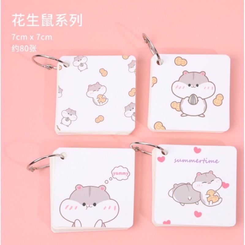 Memo atau notebook mini dengan ring lucu. Gambar karakter kelinci dan hamster yang imut. Cocok untuk dibuat catatan kecil baik untuk sekolah maupun kantor.