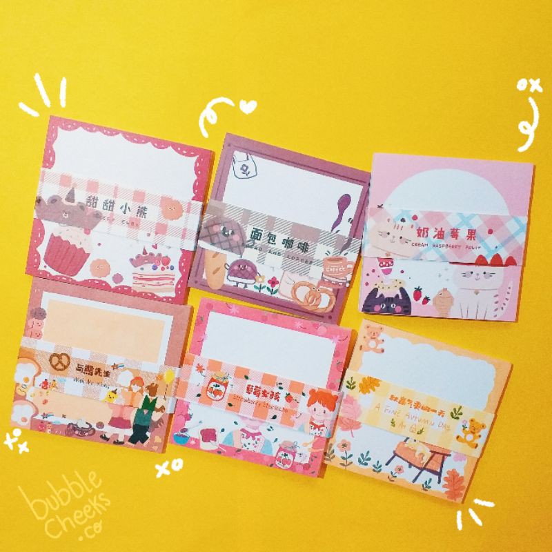 Memopad ini punya 6 desain, yaitu; Sweet Cubs, Bread and Coffee, Cream Raspberry Fruit, With Mr. Bear, Strawberry Shortcake, dan A Fine Autumn Day