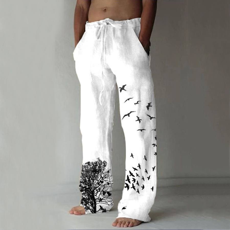 casual pants,men's casual bird print drawstring pants