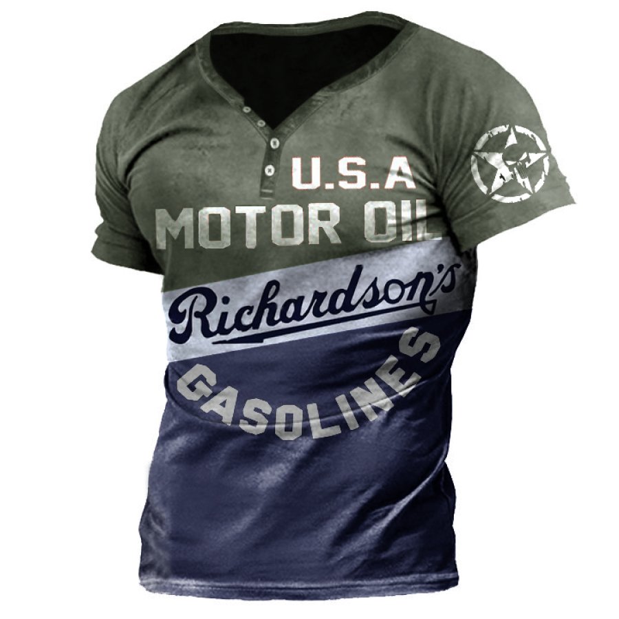 Men's Motorcycle Oil Racing Print Button-Neck T-Shirt