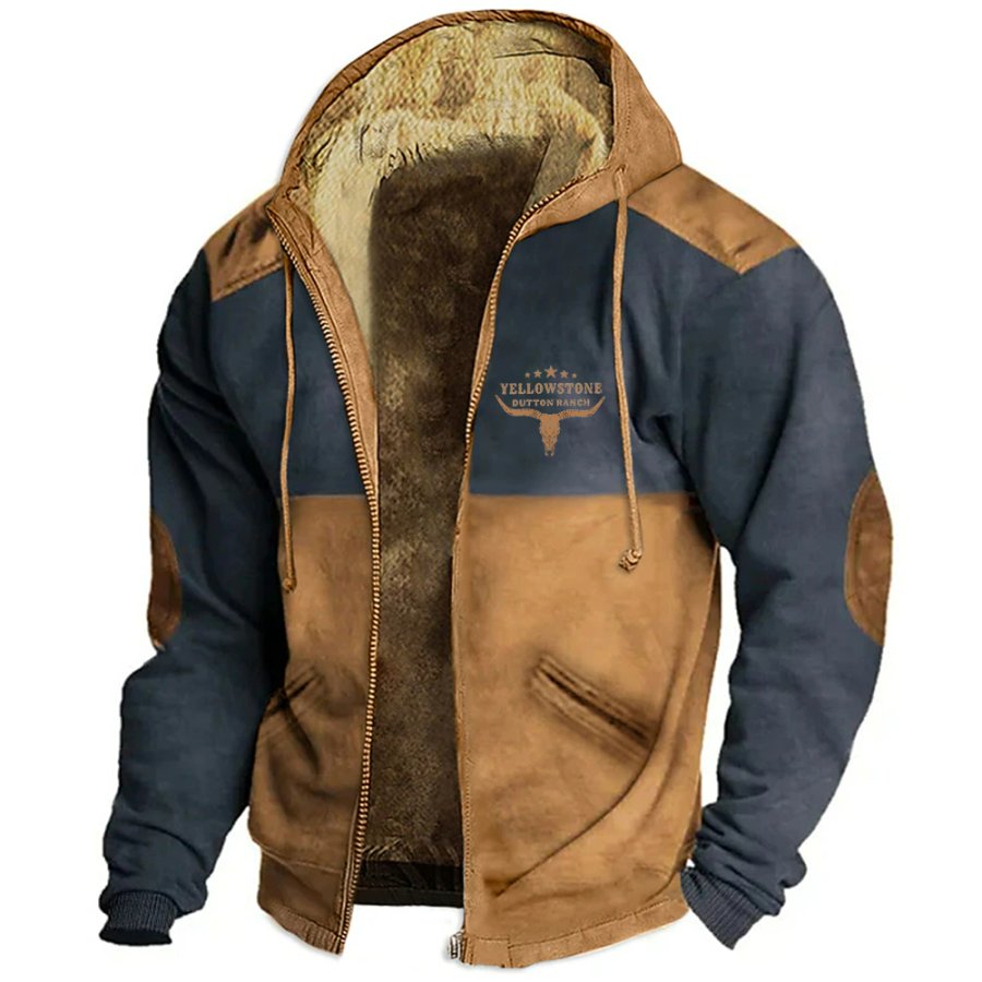 Men's Retro Western Yellowstone Print Fleece Hooded Pocket Drawstring Color Block Sweatshirt Jacket