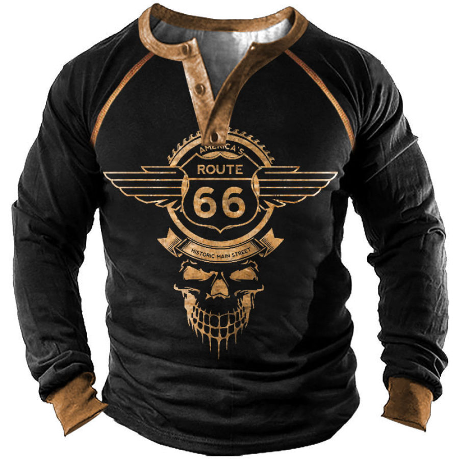 t-shirts,men's t-shirt henley route 66 skull print long sleeve contrast color daily tops