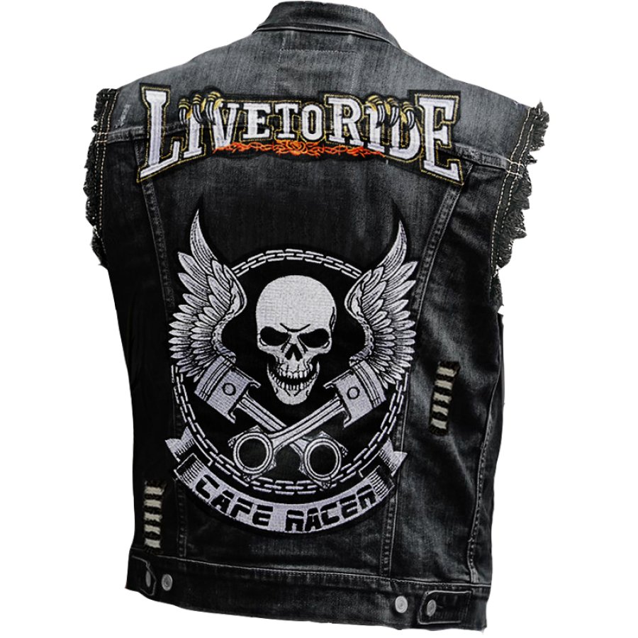 Men's Vintage Rock Punk Skull Print Washed Distressed Ripped Denim Vest Jacket