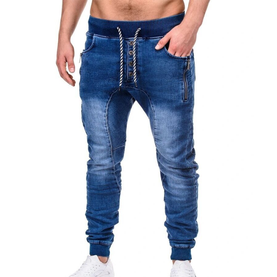 pants,men's washed drawstring button jeans