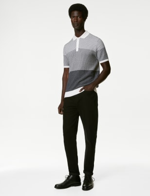 Graduated block stripes and a contrasting collar make this cotton-modal Autograph knitted polo shirt a stylish addition to your wardrobe. The geometric pattern, monostitch tipping and ribbed trims give this subtly textured piece a unique look and feel. n Autograph: premium investment pieces featuring contemporary cuts and refined finishing touches.
