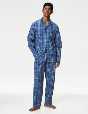 Sleep in comfort and style in this checked pyjama set. Comfy regular fit. Made from soft and breathable pure cotton. The top has a neat revere collar and fastens with buttons. The bottoms have a stretchy elasticated waist, a secure button fly and pockets for storing essentials.n Sleep in comfort and style in this checked pyjama set. Comfy regular fit. Made from soft and breathable pure cotton. The top has a neat revere collar and fastens with buttons. The bottoms have a stretchy elasticated waist and a secure button fly. Cohandy side pockets and a mock fly. n a secure button fly. Cohandy side pockets and a mock fly. a secure button fly. Cohandy side pockets and a mock fly. n M&S Collection: easy-to-wear wardrobe staples that combine classic and contemporary styles.