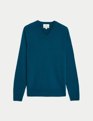 Mens M&S Collection Pure Extra Fine Lambswool V-Neck Jumper - Teal, Teal