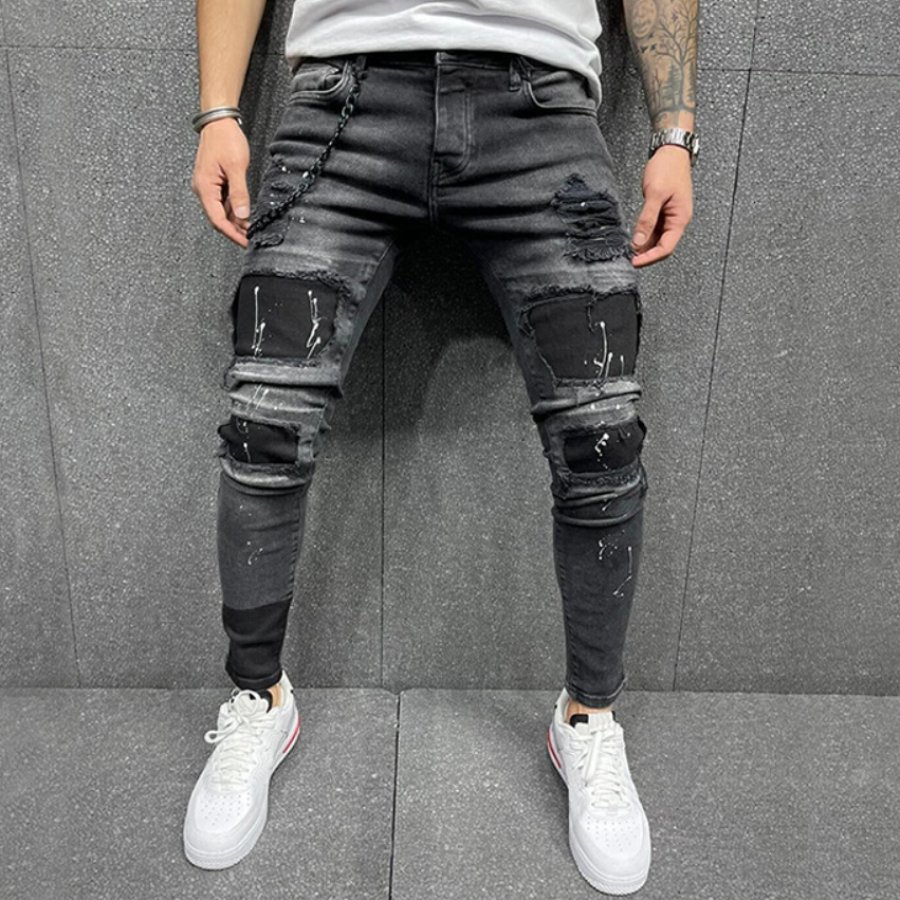Mens Patch Ripped Paint Dot Stretch Jeans