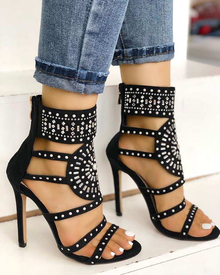 Metallic Rivet Embellished Stiletto Sandals, Black