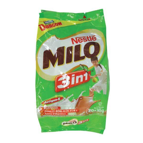 Milo 3in1 adalah minuman coklat bubuk berenergi yang dipadu dengan susu Nestle Dancow instan yang tersedia dalam kemasan pouch dan sachet Dalam satu kantong kemasan Milo 3in1 ini terdapat banyak sekali kandungan nutrisi yang dapat memenuhi kebutuhan tubuh. Ayo belanja mudah dan murah dari mana saja hanya di toko kami