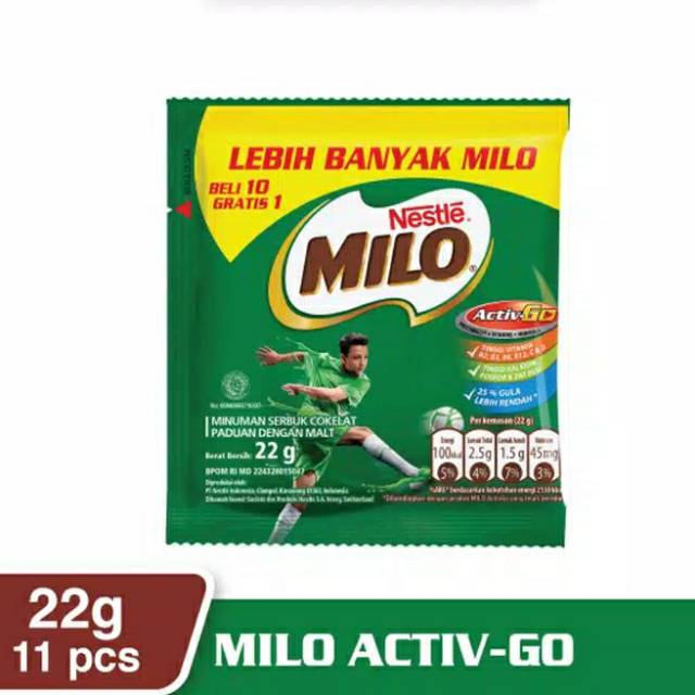 Milo Activ-Go Sachet 22gr x 11 adalah susu bubuk dengan kandungan vitamin B, vitamin C, dan kalsium serta protomalt