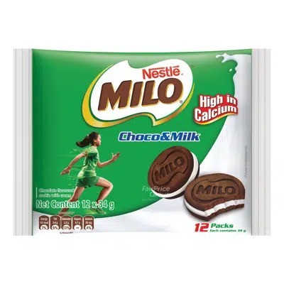 KEY INFORMATION Milo now comes in a form of a sandwich cookie biscuit with milk filling! Try it now! PRODUCT DETAILS Product Type Creamed amp; Filled COUNTRY/PLACE OF ORIGIN Colombia PREPARATION Ready to eat STORAGE INFORMATION Store in a cool and dry place INGREDIENTS Milk Chocolate [Sugar, Milk Solids (Cow #39;s Milk), Cocoa Butter, Cocoa Mass, Vegetable Fat and Oil (Palm, Illipe, Shea), Emulsifiers (Soya Lecithin, Polyglycerol Polyricinoleate), Flavouring], Wafer [Wheat Flour, Icing Sugar, Palm Kernel, Dried Glucose Syrup, Salt, Flavourings (Contains Sesame), Cocoa Powder, Stabilers (Calcium Carbonate, Sodium Bicarbonate), Emulsifier (Soya Lecithin)], Caramel Flakes • Allergen Advice: Contains milk, gluten, soya, sesame • May contain traces of peanuts and tree nuts