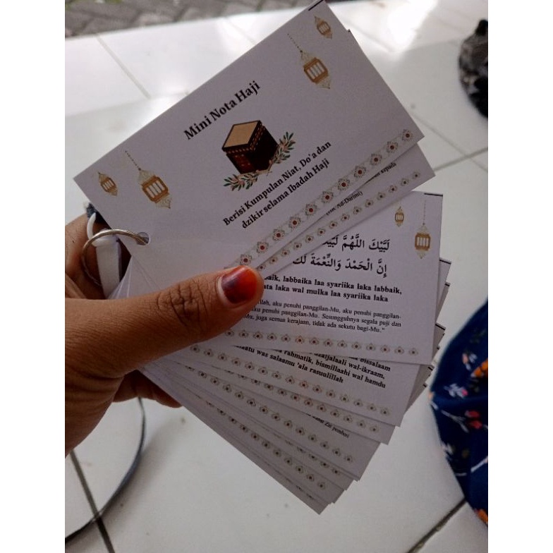 Mini Nota Haji, kartu yang dapat dikalungkan dileher, berisi kumpulan niat, do'a dan dzikir selama ibadah haji. terdiri dari 18 kartu bolak balik dan sudah tahan air sebab melewati tahap laminasi. dilengkapi dengan tulisan latin dan terjemahan. NB : 1. Penting untuk memahami untuk pembeli memahami dang mengerti JUDUL dan DESKRIPSI produk terlebih dahulu sebelum klik beli. 2. Bila ada yang kurang di mengerti pembeli bisa hubungi CS kami 3. Untuk kurir di toko kami kahanya memakai JNE saja. 4. Untuk pengiriman menggunakan jasa kirim selain JNE, semisal ingin memakai gosend, go jek dll. pembeli bisa tanyakan ke CS kami, kami akan siap membatu yang terbaik untuk pengiriman barang pesanan pembeli sesuai keinginan pembeli. 5. Barang sebelum dikirim sudah kami pastikan barang baru,berfungsi sesuai kegunaan dan ak ada cacat apapun. 6. Apabila ada kerusakan barang akibat pengiriman itu bukan tanggung jawab kami karena bila barang sudah ada di pengiriman kami sudah ak bisa memantau lagi. tetapi kami akan mengusahakan pengiriman aman sampai di tangan pembeli. 7. Setelah KLIK BELI kami anggap pembeli sudah memahami dan mengerti apa yang sudah kami jelaskan di atas, KLIK BELI = SETUJU, NOPLAIN NO RETUR ~~~~~~>>>> Kepuasan pelanggan adalah tujuan utama kami >>>>> Terima Kasih Atas Kunjungan Anda