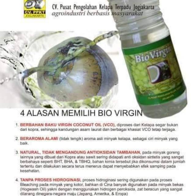 Bio Virgin adalah minyak goreng super terbuat dari Virgin Coconut Oil yang terkenal sebagai minak sehat alami mengandung asam laurat yang sangat tinggi, sehingga sangat baik jika digunakan untuk memasak.