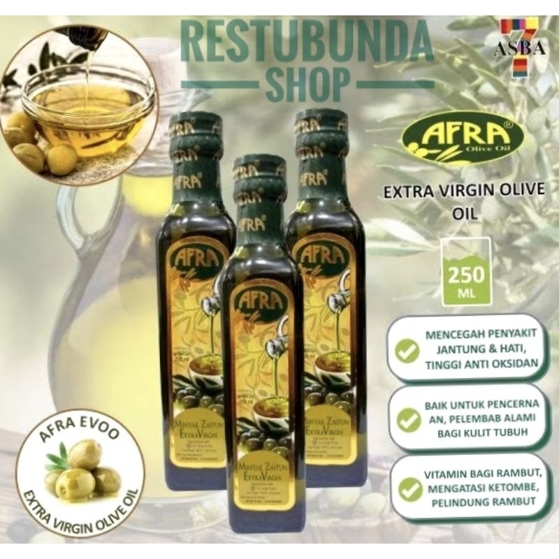 AFRA merupakan minyak zaitun extra virgin (minyak perawan) yang dihasilkan dari perasan buah zaitun pertama dan merupakan minyak zaitun terbaik karena tidak melalui banyak proses sehingga memiliki kualitas yang lebih tinggi. Aman diminum atau dioleskan, bermanfaat sebagai obat luar dan dalam, sebagai campuran makanan atau masakan, minyak urut, minyak rambut, penghalus kulit, untuk kecantikan wajah, pijat ataupun lulur.