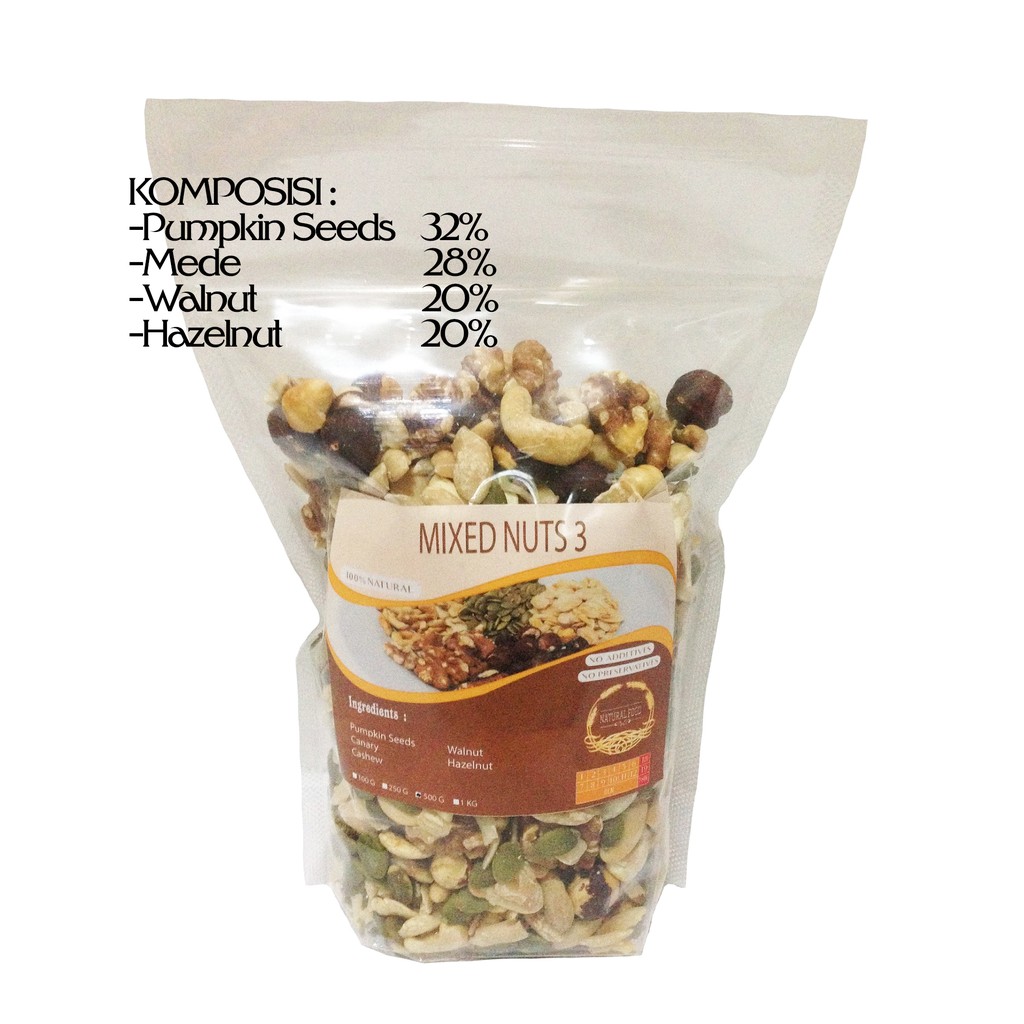 -Pumpkin Seeds 25%, Kacang Mede 25%, Walnut 25%, Hazelnut 25%