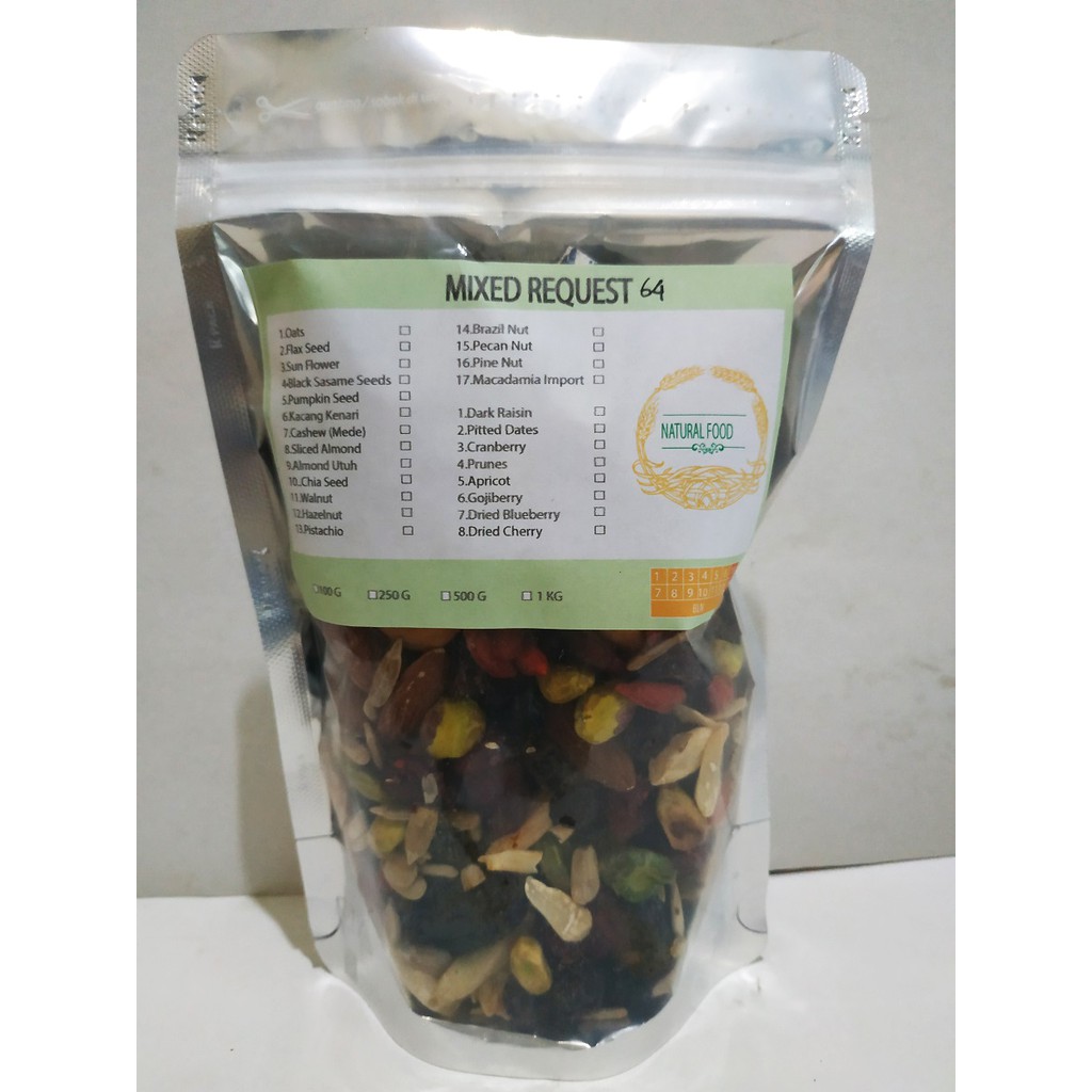 sun flower 10% kacang kenari 15% kacang mede 10% almond 10% pistachio 10% dark raisin 15% pitted dates 10% cranberry 10% prunes 5% gojiberry 5%