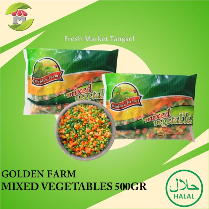 Golden Farm Mixed Vegetables adalah campuran sayuran beku berkualitas dengan Rasa yang Nikmat dan Cocok Untuk Disajikan Sebagai Makanan Pendamping.