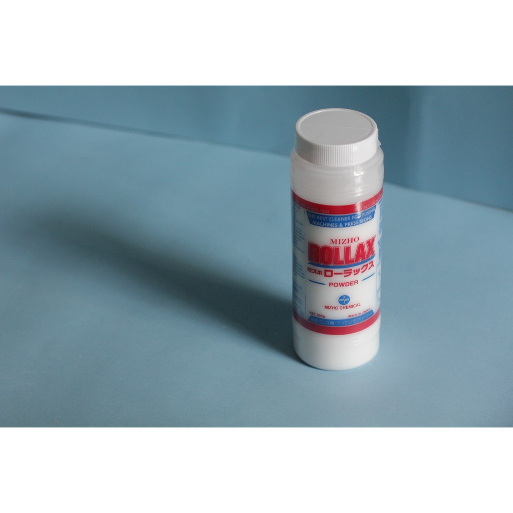 ROLLAX is a powdered cleaner which has been developed by MIZHO CHEMICAL CO.,LTD. to remove adhesive residue from operating surfaces of interlining fusing machines and irons. In addition, when used regularly, ROLLAX acts as a release agent, reducing further sticking of adhesive to operating surfaces and preserving Teflon-coated belts and plates.