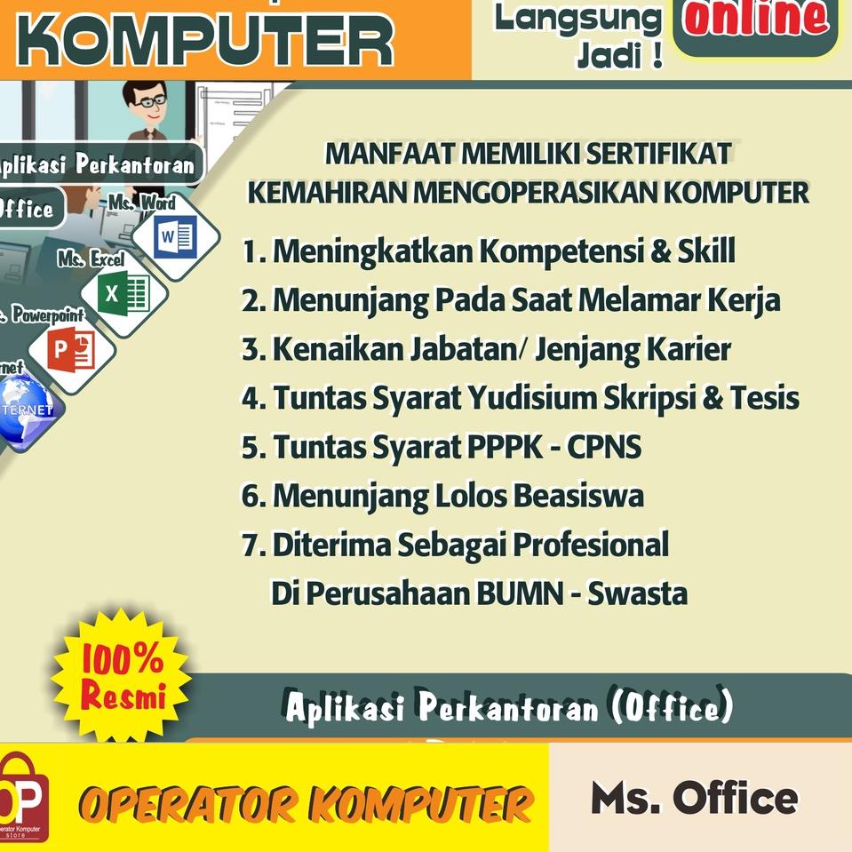 BUDAYAKAN MEMBACA SEBELUM MELAKUKAN PEMBELIAN Sertifikat Komputer Resmi (Ms. Office Dan Internet) - Online Penunjang Persyaratan Dikeluarkan oleh Instansi Legalitasnya 100% Resmi. Lebih lanjut Chat saja langsung - Fast respon jam kerja Senin - Jumat pukul 9.00 - 17.00, Sabtu pukul 9.00 - 14.00, Minggu atau hari libur Off - Mohon mencantumkan warna/gambar/varian pilihan dan cadangannya (jika ada) di kolom pemesanan ya. Jika tidak mencantumkan pilihan, maka akan kami kirimkan sesuai stok yang ready!!! - Pengiriman pada H+1 (malamnya). - Jika barang yang di pesan kosong dan tidak ada respon selama 1x24 jam maka akan di kirim secara random. - Periksa kembali NOMOR HP (TELP) & ALAMAT LENGKAP. Guna mempercepat dan memperlancar pengiriman. - BARANG YANG SUDAH DI BELI TIDAK BISA DI KEMBALIKAN. - Gudang kita ada di DKI Jakarta, Jawa Timur, Jawa Tengah, Jawa Barat dan lainnya. Jadi pengiriman tidak selalu sesuai alamat toko ini yaaa.. >>>> MEMBELI = SETUJU