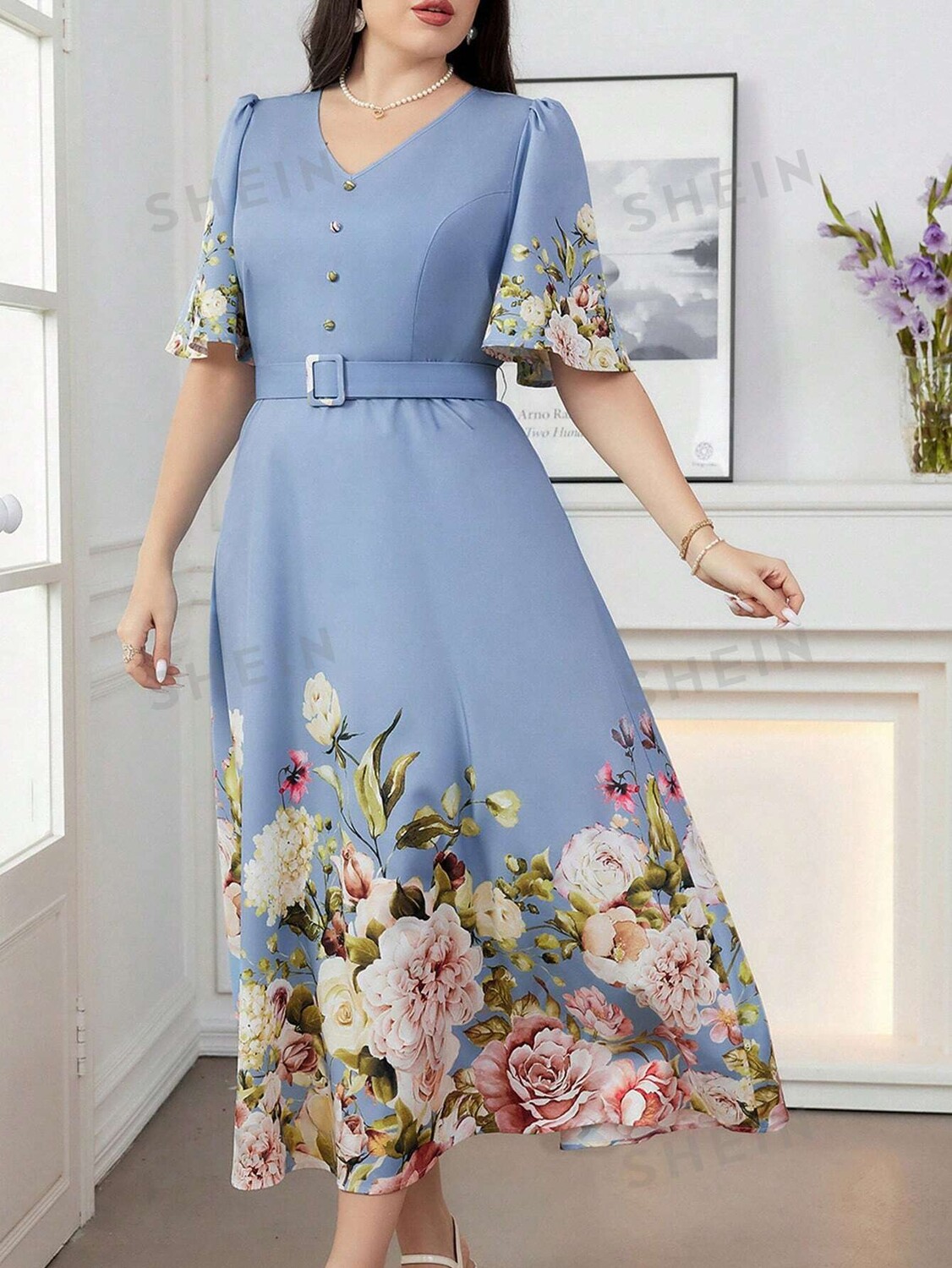 Modely Праздничное платье больших размеров с v-образным вырезом и цветочным принтом Shein, мультиколор