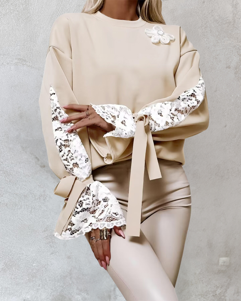 Moletom com estampa floral em bloco de cores e manga comprida amarrada com patch de renda, Apricot