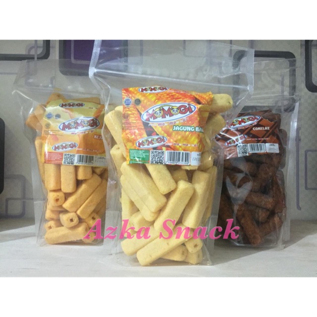 * Snack original momogi rasa cokelat, jagung bakar dan keju.