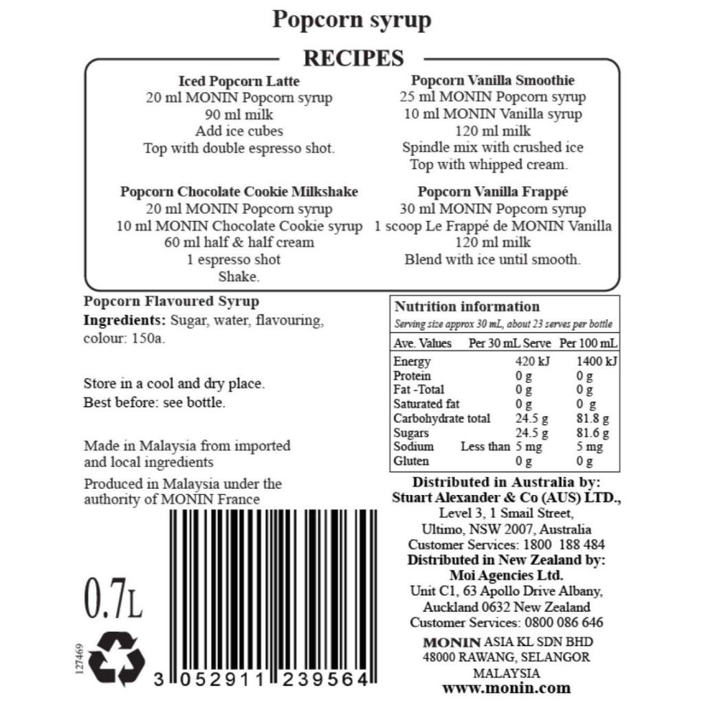 The deliciously simple savoury flavours of starchy popcorn and salted butter make a great combination for a movie time snack, and also a great enhancement to a sweet drink. MONIN Popcorn syrup can be added to milkshakes and lattes, cocktails and mocktails, and even drizzled over any kind of dessert as a fun alternative to the usual sort of toppings.MONIN Popcorn syrup mixes salty with sweet in smoothies, milkshakes, lattes, cocktails, mocktails, and also as a dessert topping.Colour: Gold with slight amberTasting Notes:-Nose: Intense buttery popcorn-Attack: Strong balanced buttery note-Length in mouth: Well-rounded buttery popcorn with light roasted after taste