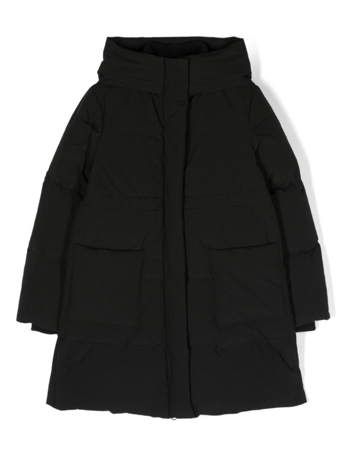Черный, гусиный пух, дутый материал, вышитый логотип на рукаве, высокий воротник, потайная застежка спереди, классический капюшон, два накладных кармана спереди и прямой подол.