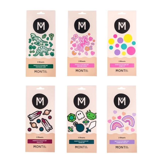 Bring some extra fun to lunch times with our new Sticker Sets! Dishwasher safe, waterproof, and made to match your favourite Montii prints, each pack contains 3 sheets of stickers for you to personalise your Bento Boxes, Drink Bottles and more!