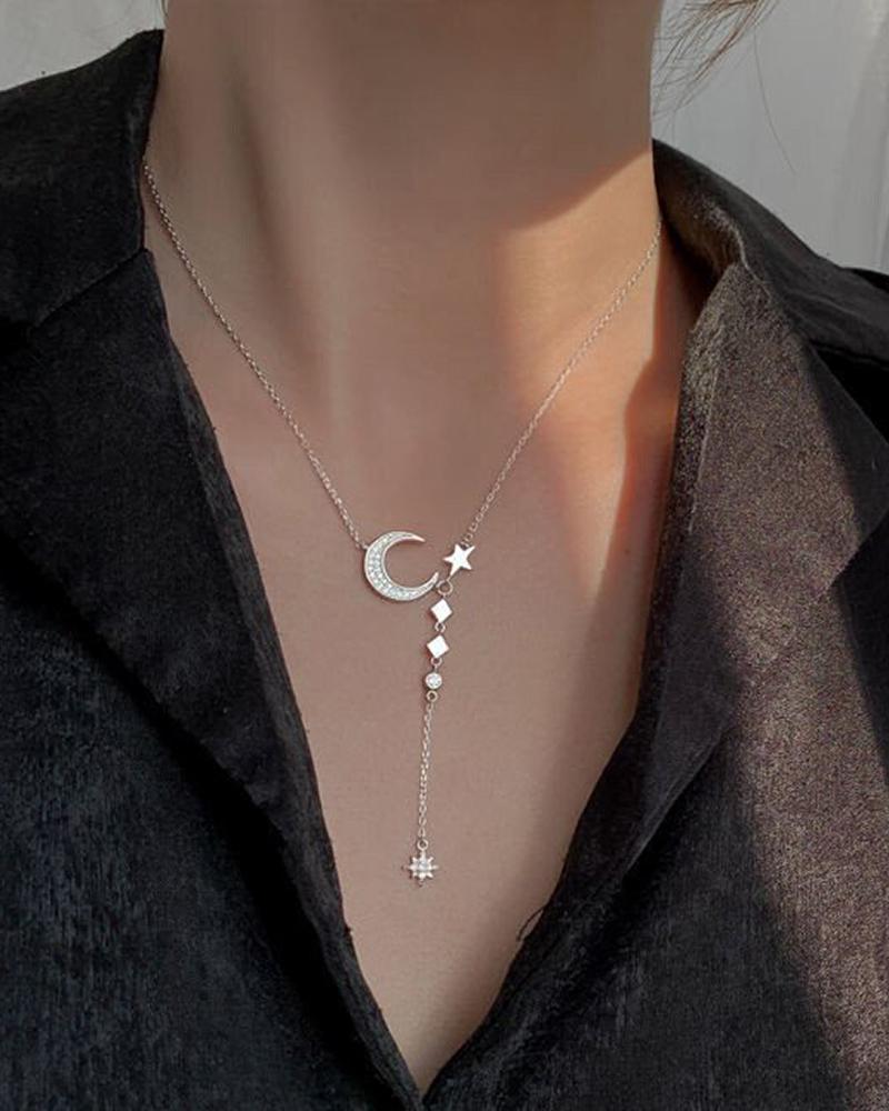 Moon Star Pattern Rhinestone Chain Necklace, Gold