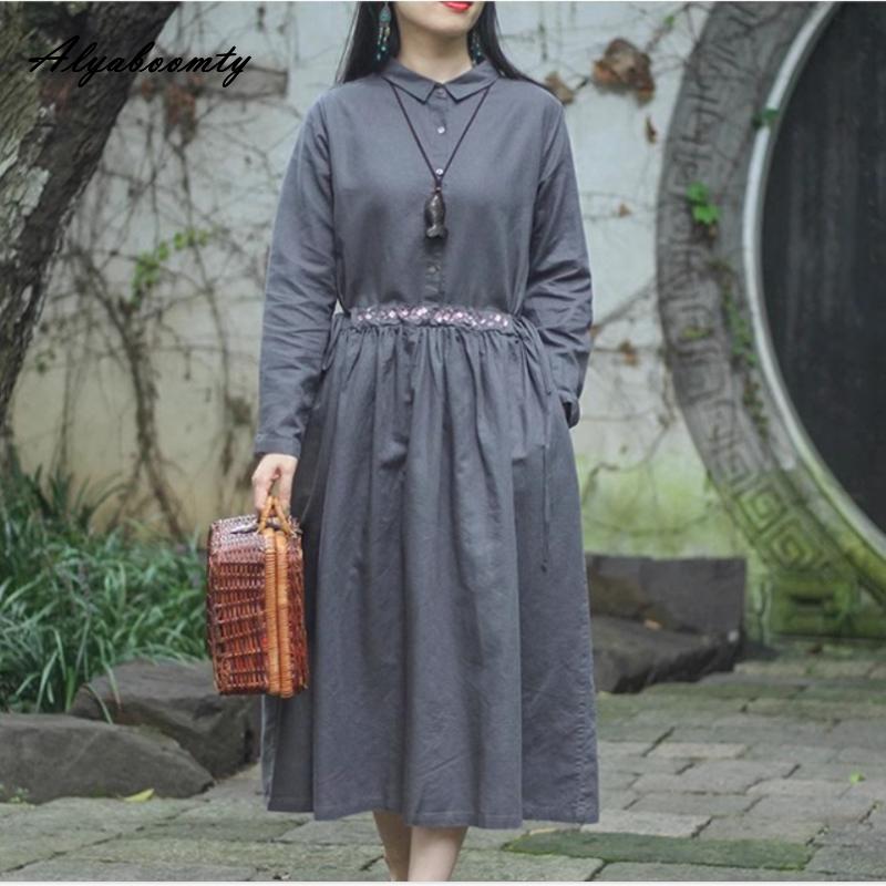 Mori Girl Весна Осень Женское Серое Платье Отложной Воротник Цветочная Вышивка Платье На Шнуровке Винтажное Длинный Рукав Повседневное Свободное Платье XXL