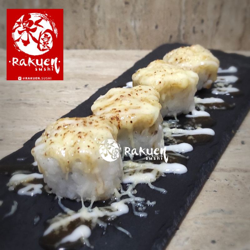 Sushi dengan isian Salmon, crispy topped with cheese melted roasted