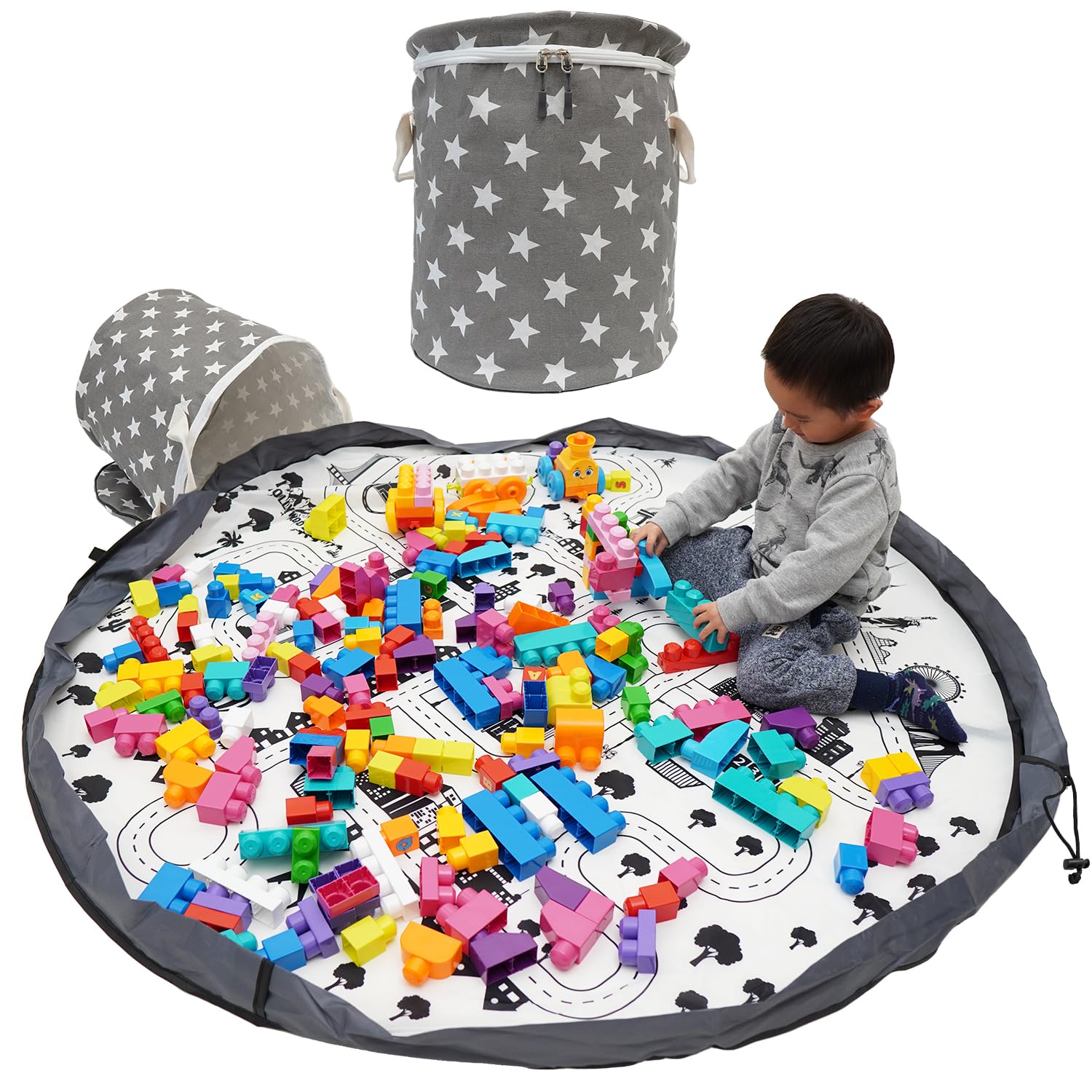 Mugyu Игрушечный коврик для хранения игрушек, Игрушечный ящик, Коврик с дорожным узором, Большая вместительная сумка с крышкой, стильный чехол (Звездный серый)